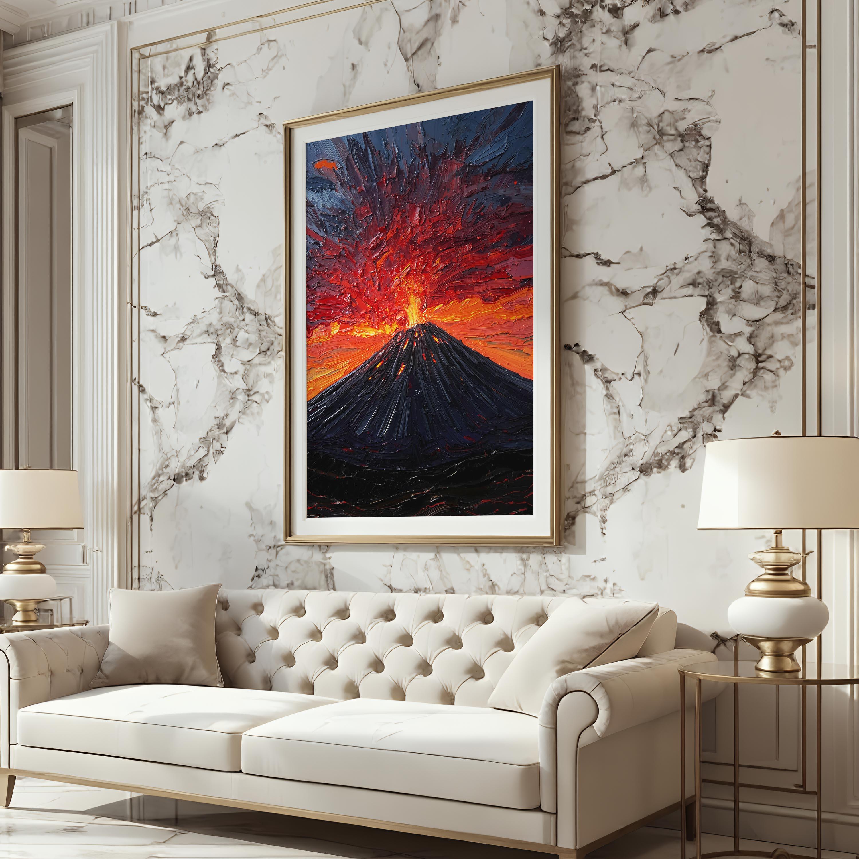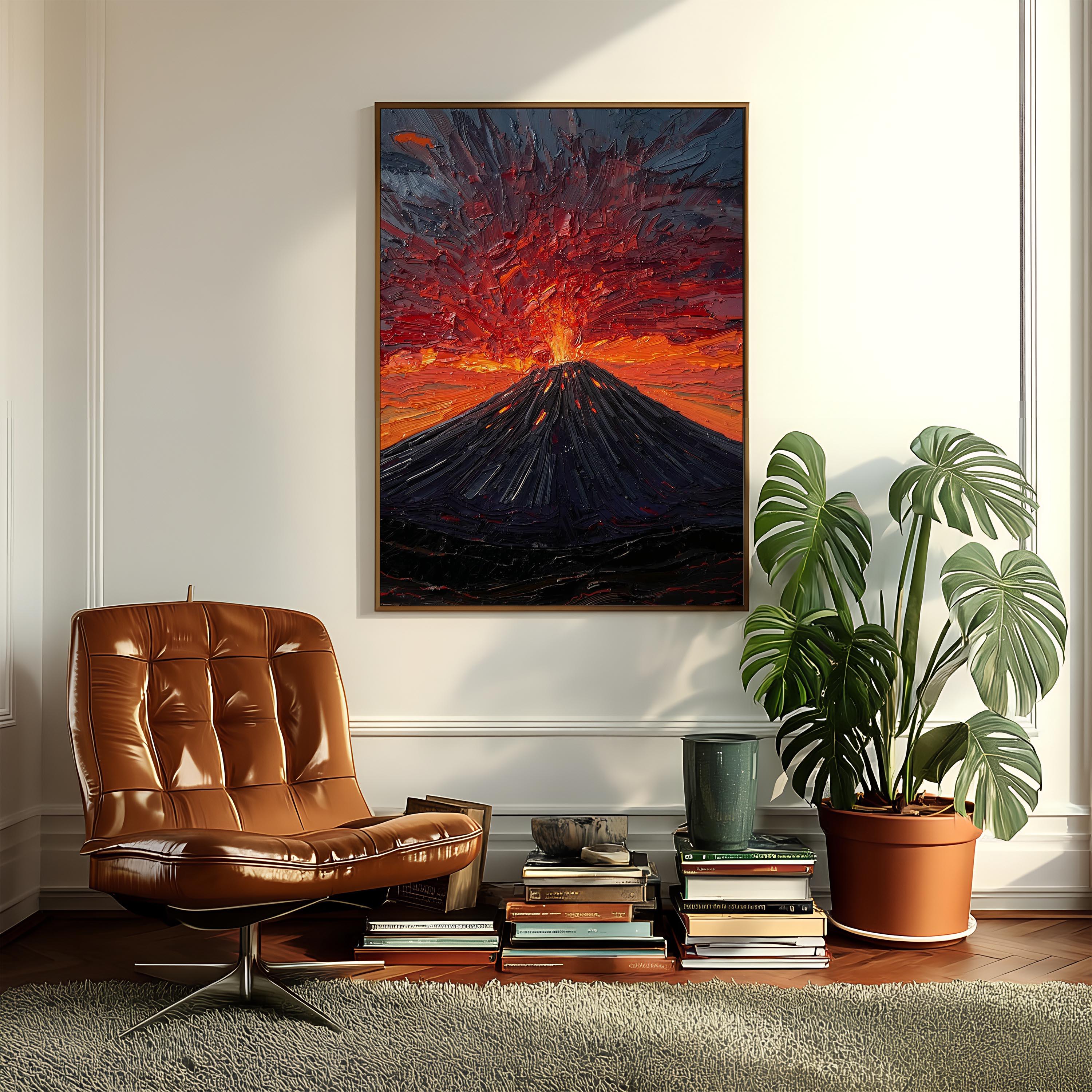 This artwork captures a powerful volcanic eruption — raw, untamed, and bursting with energy.