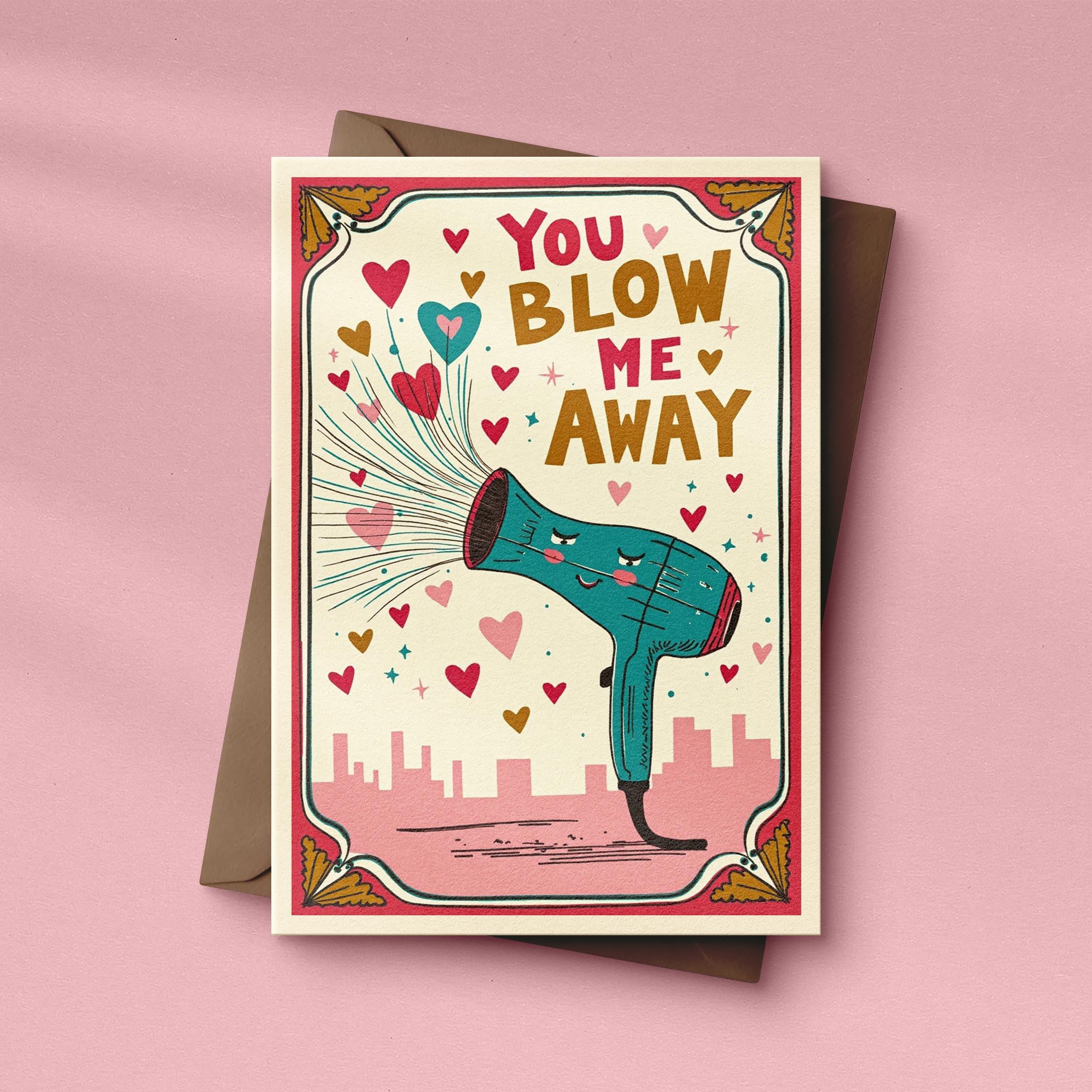 You Blow Me Away Valentinstagskarte | Lustige A6 Grußkarte | Retro Liebeskarte mit Föhn-Motiv | Karte für Partner mit Umschlag