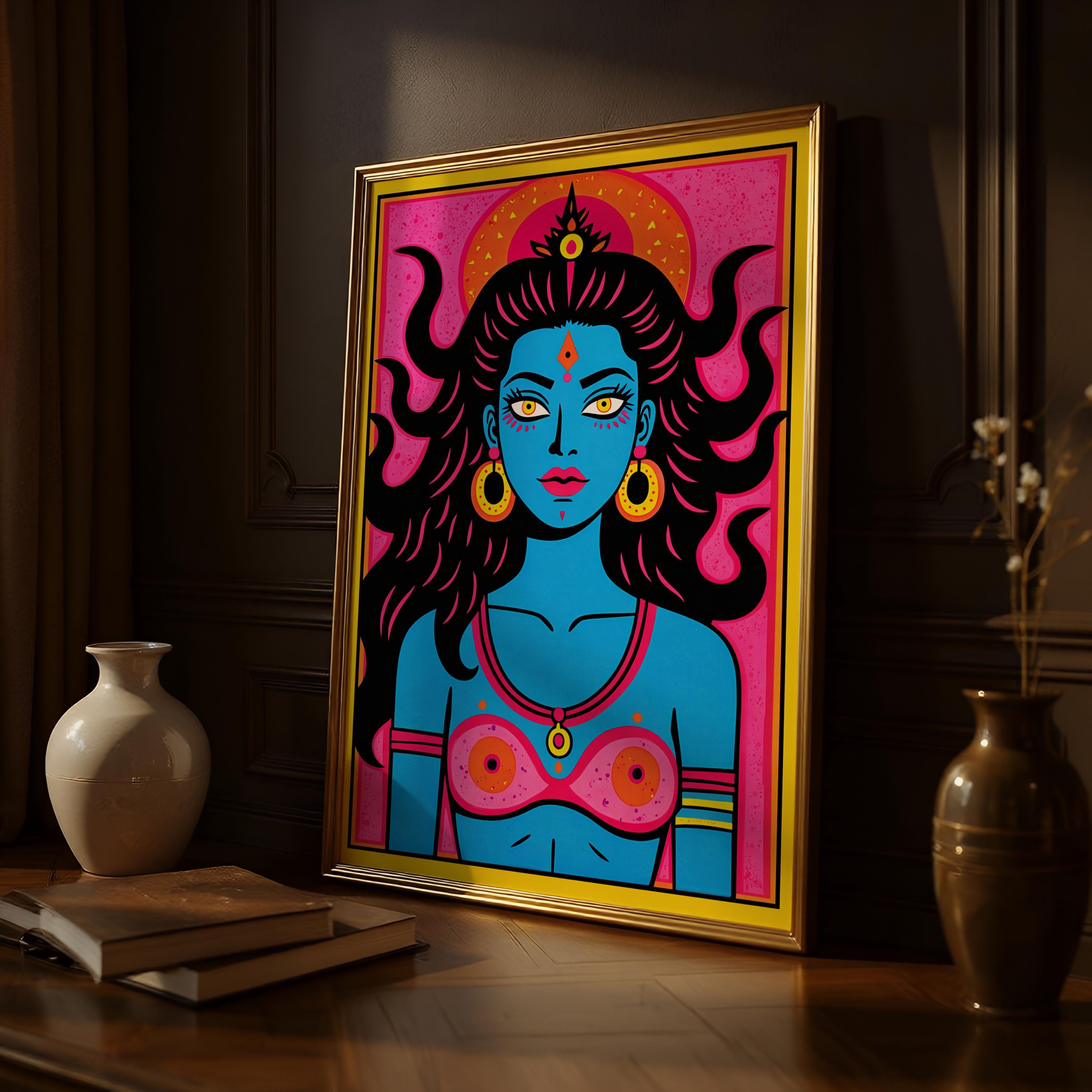This bold and vibrant fine art print is inspired by the energy of the divine feminine and the iconic symbolism of goddess Kali β reimagined in a modern, graphic, pop-art style.